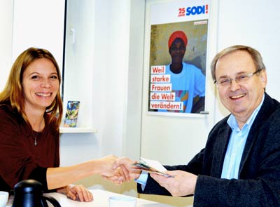 Dr. Urbich, Geschäftsführer und Gründungsmitglied des Kommunalen Bildungswerk e.V. (KBW), besuchte am 20.12.2016 die Geschäftsstelle von SODI, um Patricia Schulte, Referentin für Fundraising, ein Bündel Geldscheine sowie einen Barscheck zu übergeben.